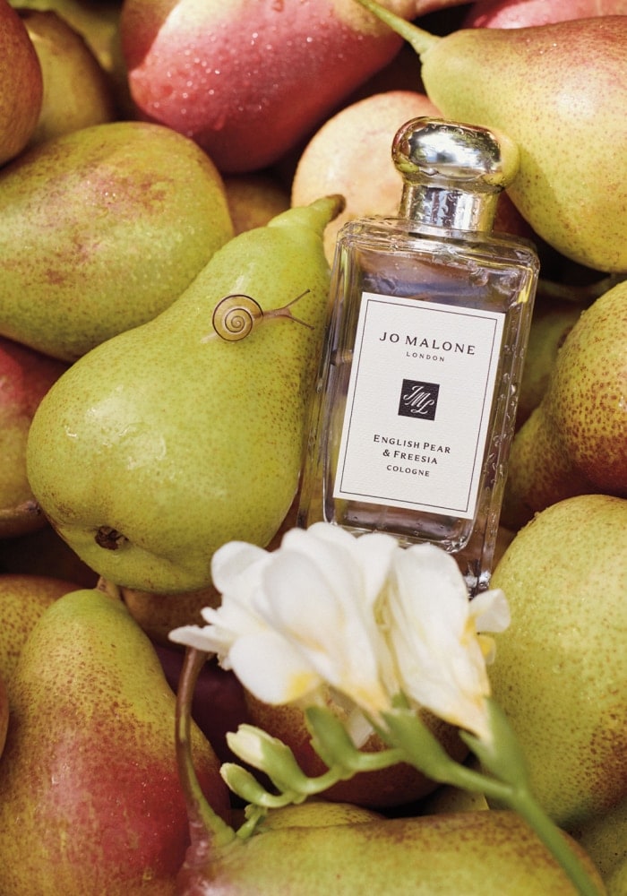 Los huertos bañados por el sol dorado calientan las curvas de las peras deliciosas. La sensual frescura de la fruta recién madurada envuelta en elegantes fresias blancas, realzada con rosa y arraigada en pachuli.